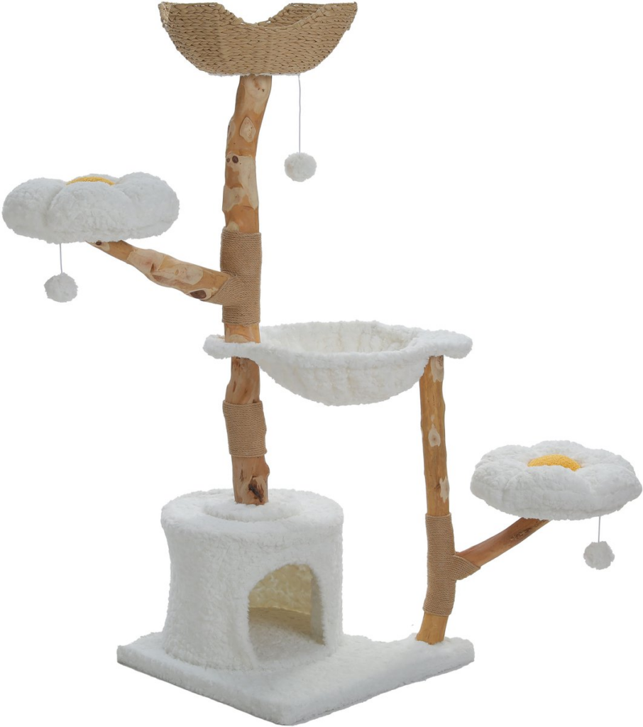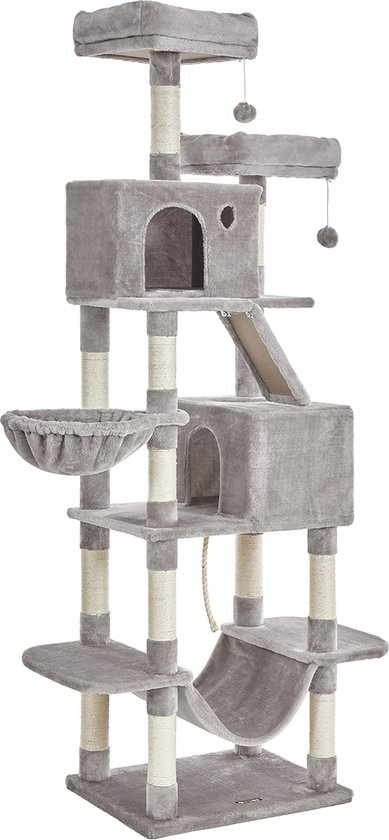 Deze krabpaal biedt alles wat een kat nodig heeft: meerdere ligplekken, stevige sisalpalen en voldoende hoogte om te klimmen.